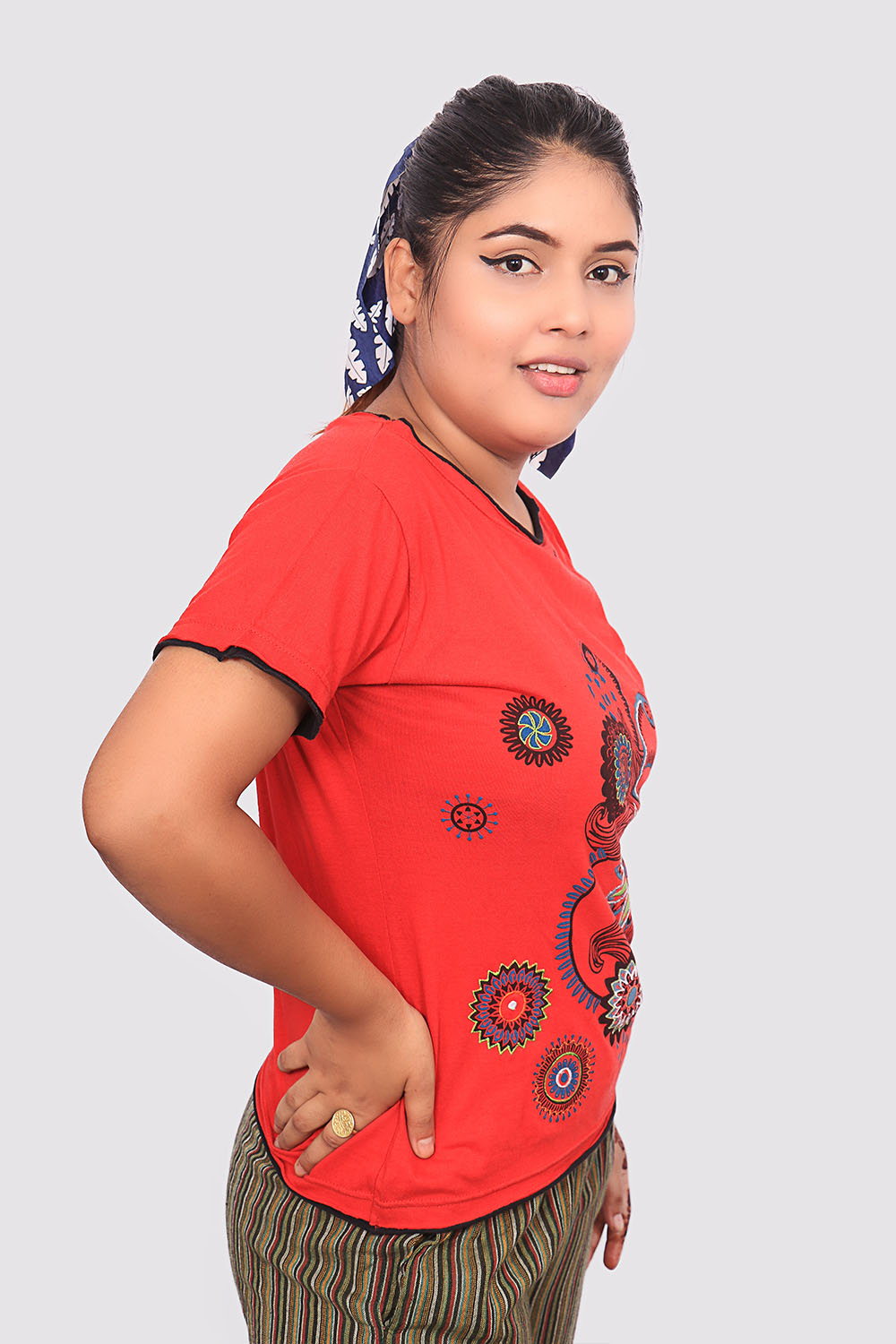 Half Sleeve Tops Made up with sinker Nepali Cotton. It has round neck with hand work on patch on front part.